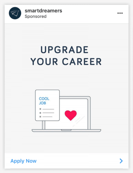 A basic and yet effective design for an Instagram ad is to select one or more stock photos that are representative for your services and pair them up with overlay text messages that are well targeted. The following example comes from a business school and the images and texts featured by each of the carousel slides are describing exactly what are they offering to their students.