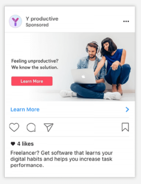If you are offering something that is useful for your customers, you can also advertise that on your Instagram banner. The following Instagram ad idea from Y productive is quite relevant for a solution giving advertisement. There is the question, the call to action and in the description section, we find out to whom the visual is addressing.