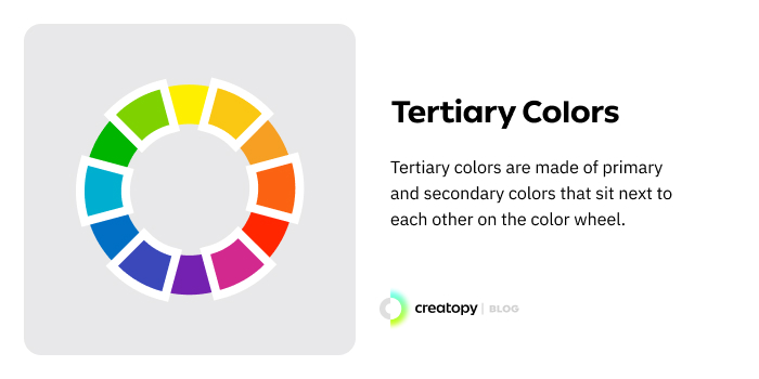 Tertiary colors are made of primary and secondary colors that sit next to each other on the color wheel. There are six: