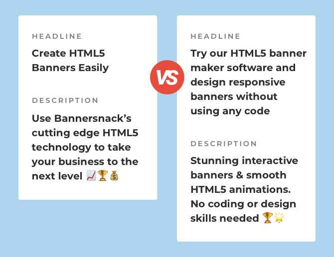 The ad copy should convey loud and clear what your potential customer will get (Stunning interactive banners & smooth HTML5 animations), and not be focused on the features you provide (Use Creatopy’s cutting edge HTML5 technology).